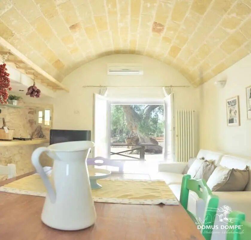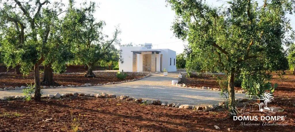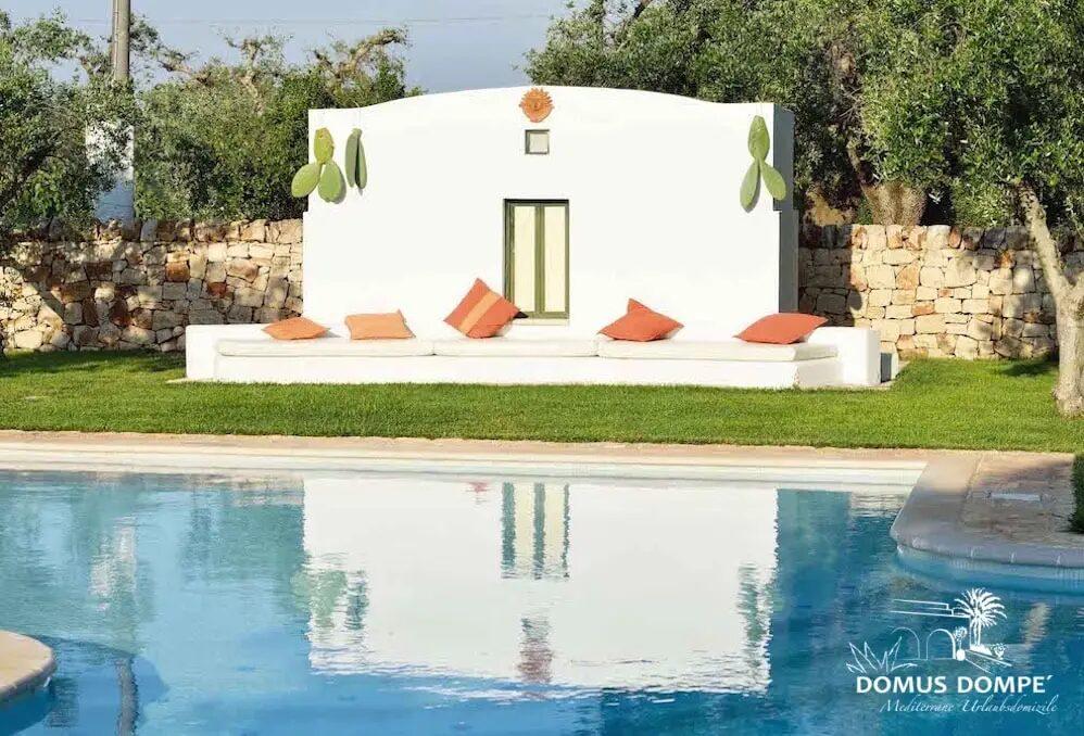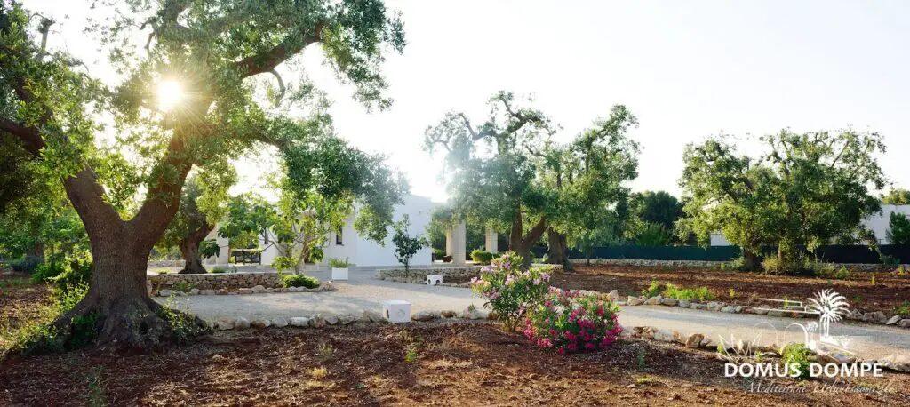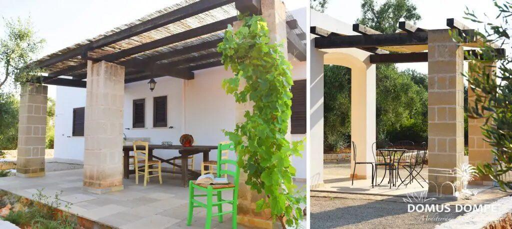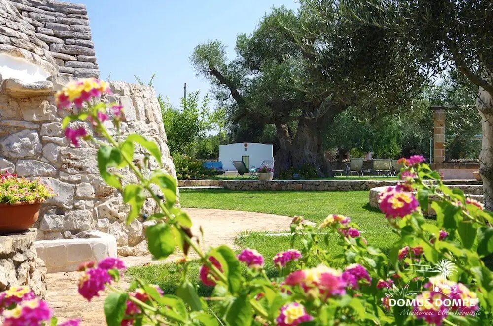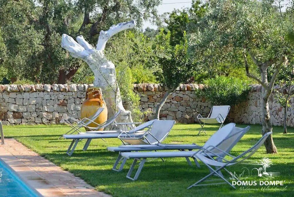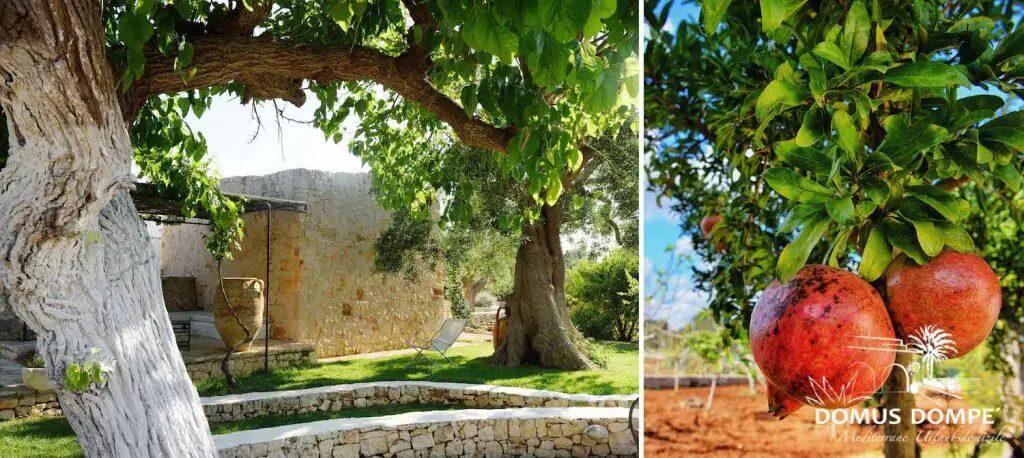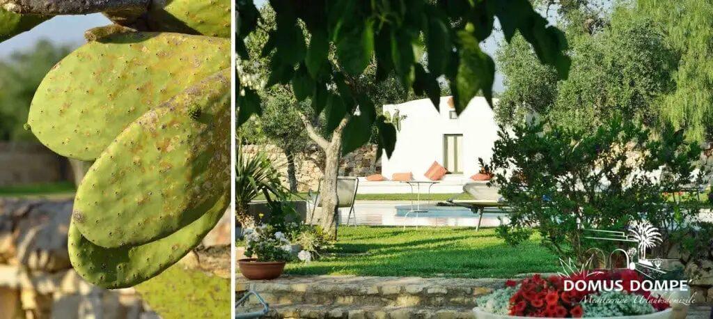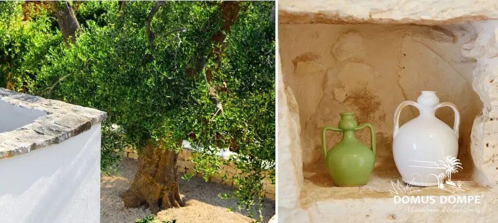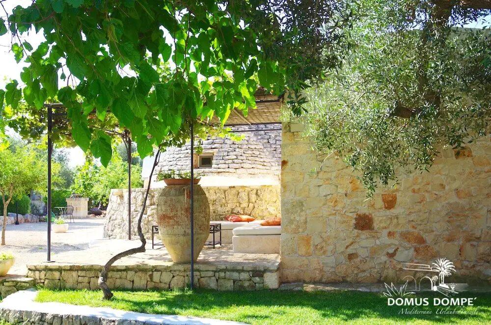 Schöne Freisitze unter den silbrig-grün schimmernden Olivenbäumen, gemauerte Sitzbänke mit zahlreichen Kissen, die zum Faulenzen einladen, wildgewachsene Kaktusfeigen und die typisch apulischen Trockensteinmauern unterstreichen die besondere, sehr persönliche Atmosphäre des Anwesens. Rote Granantäpfel, stämmige Mandelbäume, antike hohe Keramikgefäße und hier und da stehende Blumenkübel fügen sich harmonisch in das herrliche Landschaftsbild ein.