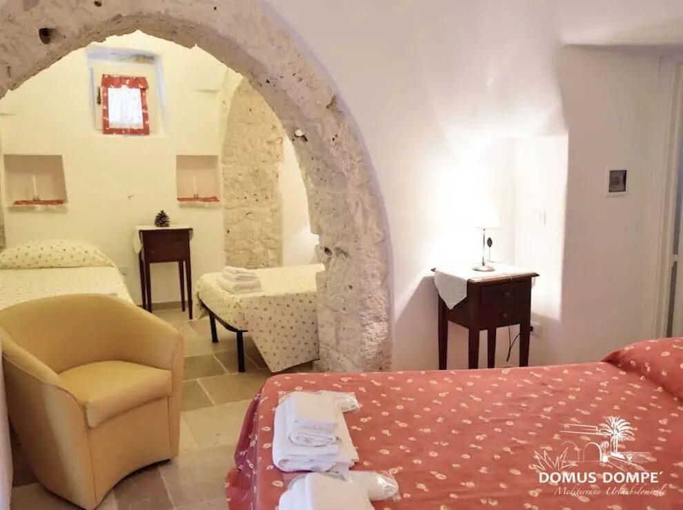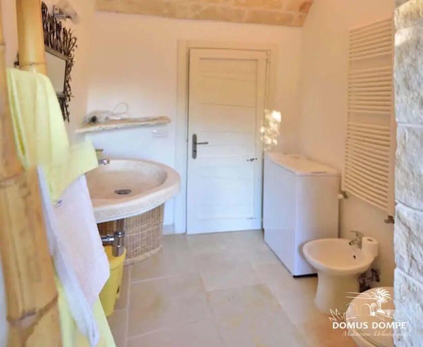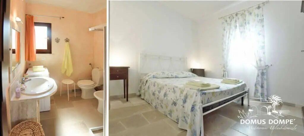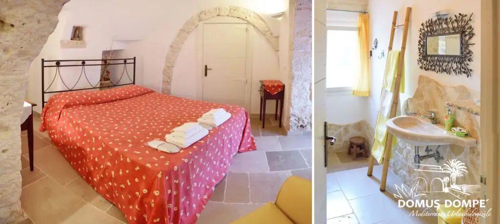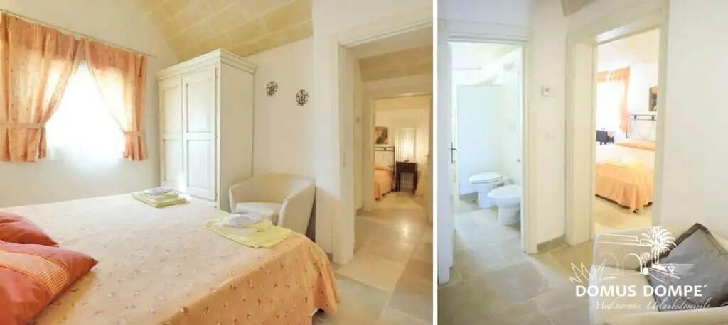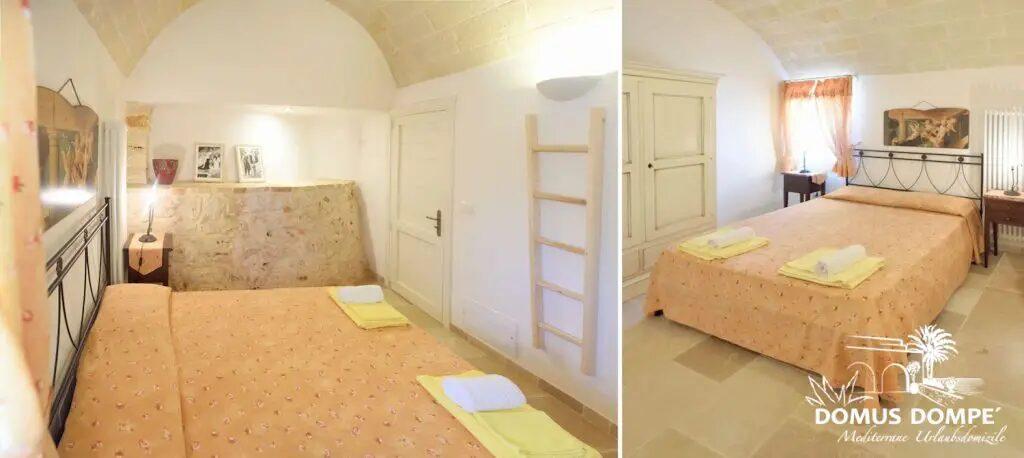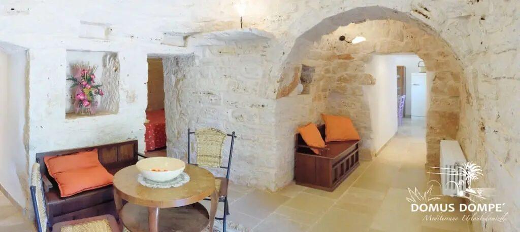 Die beiden wunderschönen Trulli mit ihren klaren Formen, die auf das 19. Jahrhundert zurückgehen, sind sehr charmant. In der Restaurierungsphase wurden die antike Bausubstanz und der ursprüngliche Charakter bewahrt. Eine perfekte Synthese aus Vergangenheit und Gegenwart. Die Einrichtung ist im typischen Landhausstil, essentiell aber geschmackvoll und apart. Die Holzleiter, die einst die Bauern zur Feigenernte verwendeten, dient als Handtuchhalter im Badezimmer. Sehr schön ist der hochwertige Steinboden (pietra di Trani) wie auch der freigelegte Naturstein im Inneren des Trullo. Typisch sind hier auch die unterschiedlichen Deckenhöhen. Auf dem weitläufigen antiken Vorplatz des Trullo, der mit Gartenmobiliar ausgestattet ist, lässt sich im Schatten des großen, roten Maulbeerbaumes herrlich der Espresso mit Blick auf den Pool schlürfen.