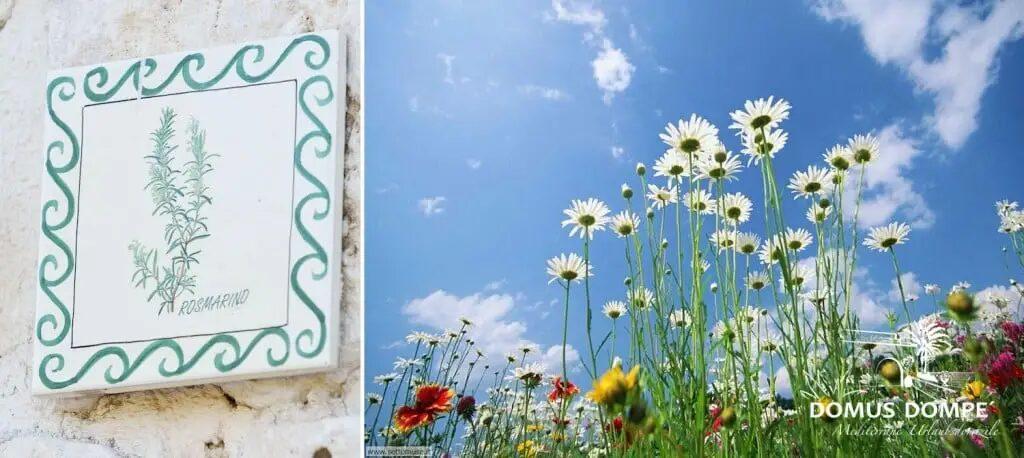 Der Trullo Rosmarino hat hingegen 1 Doppelzimmer und 1 Vierbettzimmer, 2 Badezimmer mit Dusche und Küche. Dann gibt es einen angrenzenden Wohnraum in der Lamia, TV-Ecke und Tisch. Eine große Laube mit Essbereich und eine kleinere, begrünte Laube mit gemauerter Sitzbank und Tischchen dienen für erholsame Stunden im Freien. Insbesondere die kleinere bietet sich für eine Siesta im Schatten an, die höchstens gelegentlich vom Gesang der Zikaden unterbrochen wird, insbesondere an heißen Julitagen. Ein wunderbarer Olivenhain (3 Ha), der von Trockensteinmäuerchen umrahmt wird, Obstplantagen und die herrlichen Heilpflanzen vereinen die Düfte und die Ruhe.