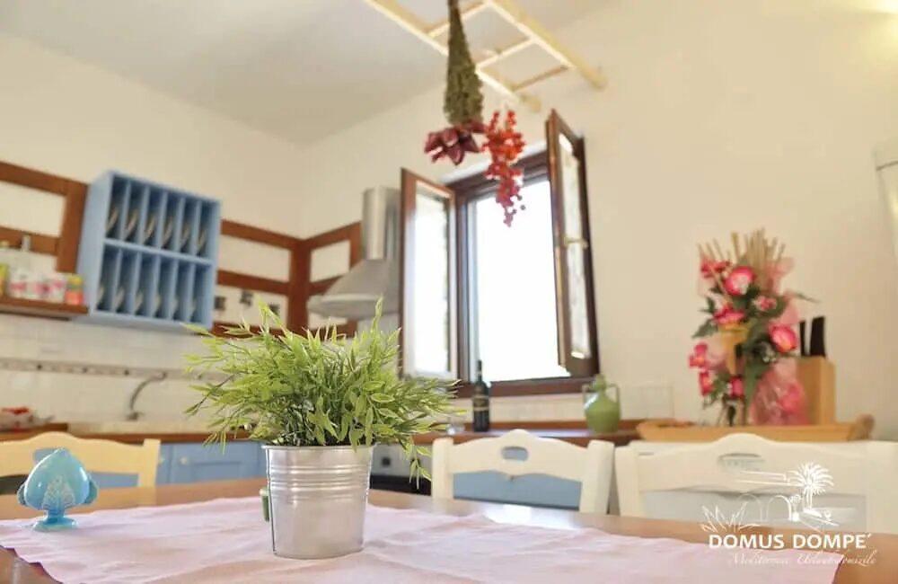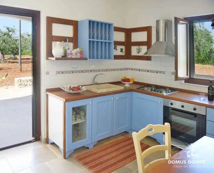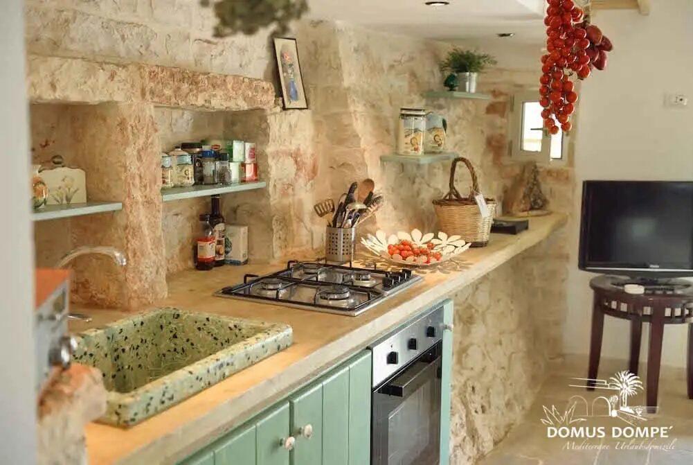 Der Trullo Basilico verfügt über 3 Schlafzimmer, 2 Badezimmer mit Dusche, einen Eingangsbereich und eine große offene Küche. Auf der Veranda mit einem schattigen Schilfrohrdach ist der Essplatz.